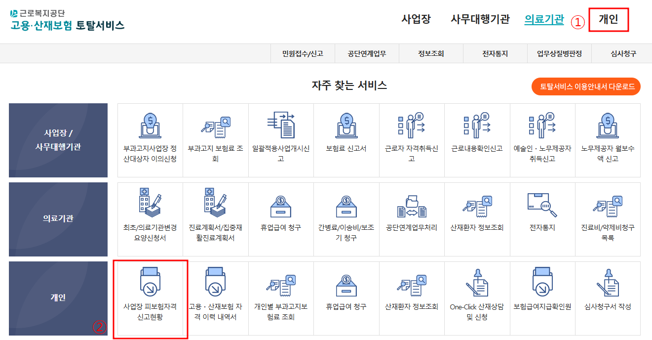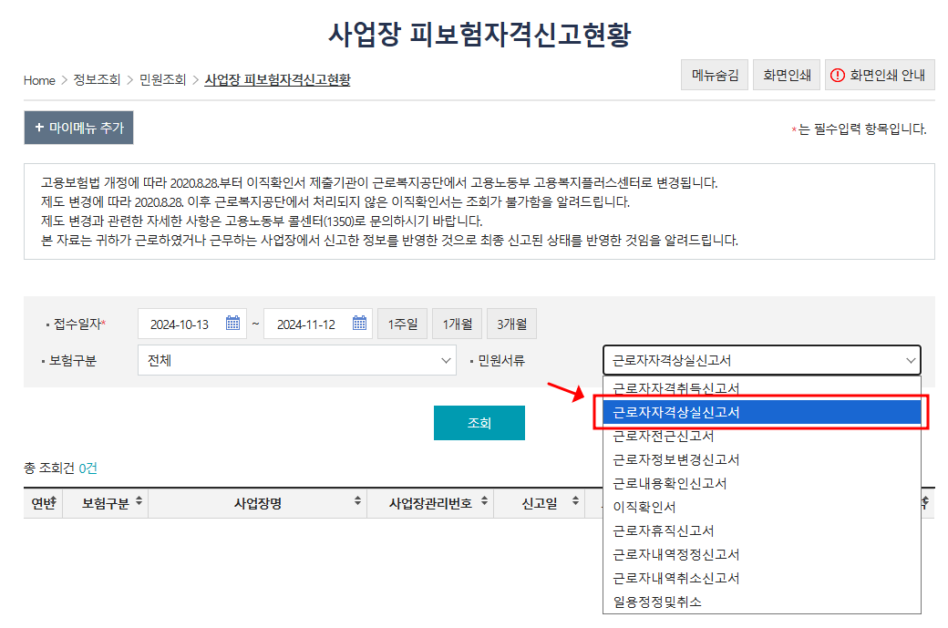 - 고용산재보험 토탈서비스에서 자격 상실 신고 확인