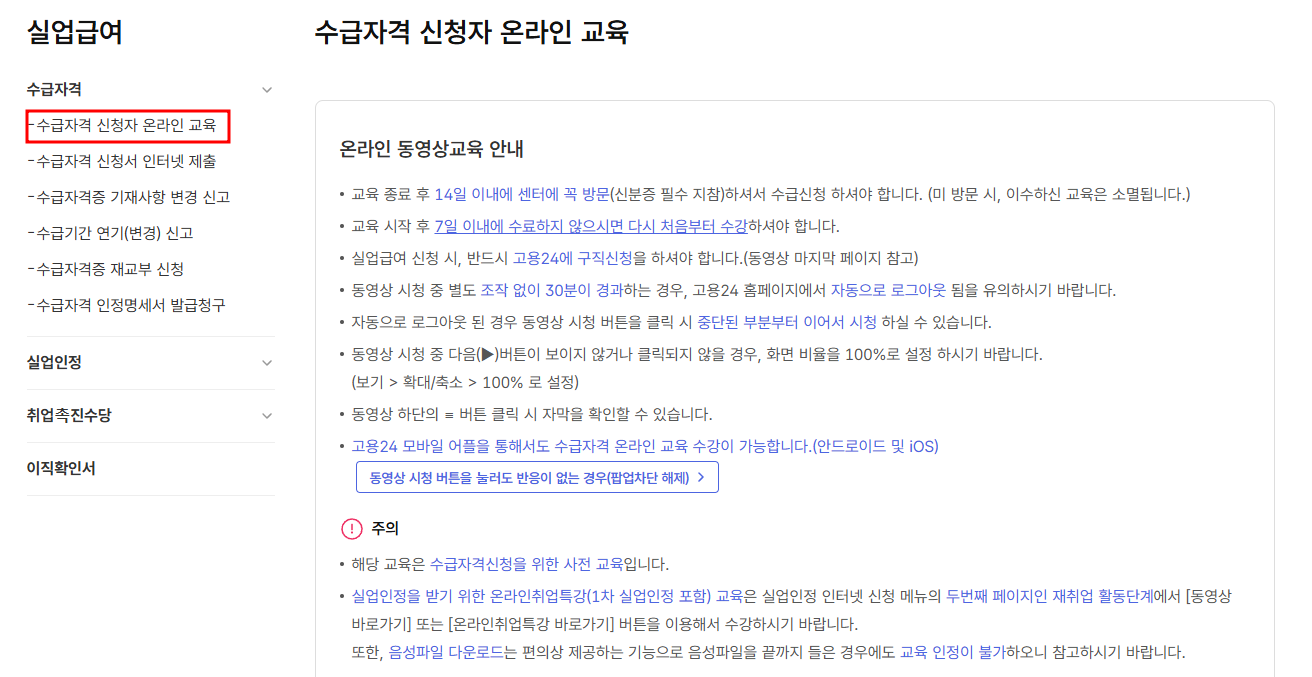 | 온라인 교육 이수 | 수급자격 신청자 온라인 교육 수강 | 음소거, 빠른 재생 불가 |